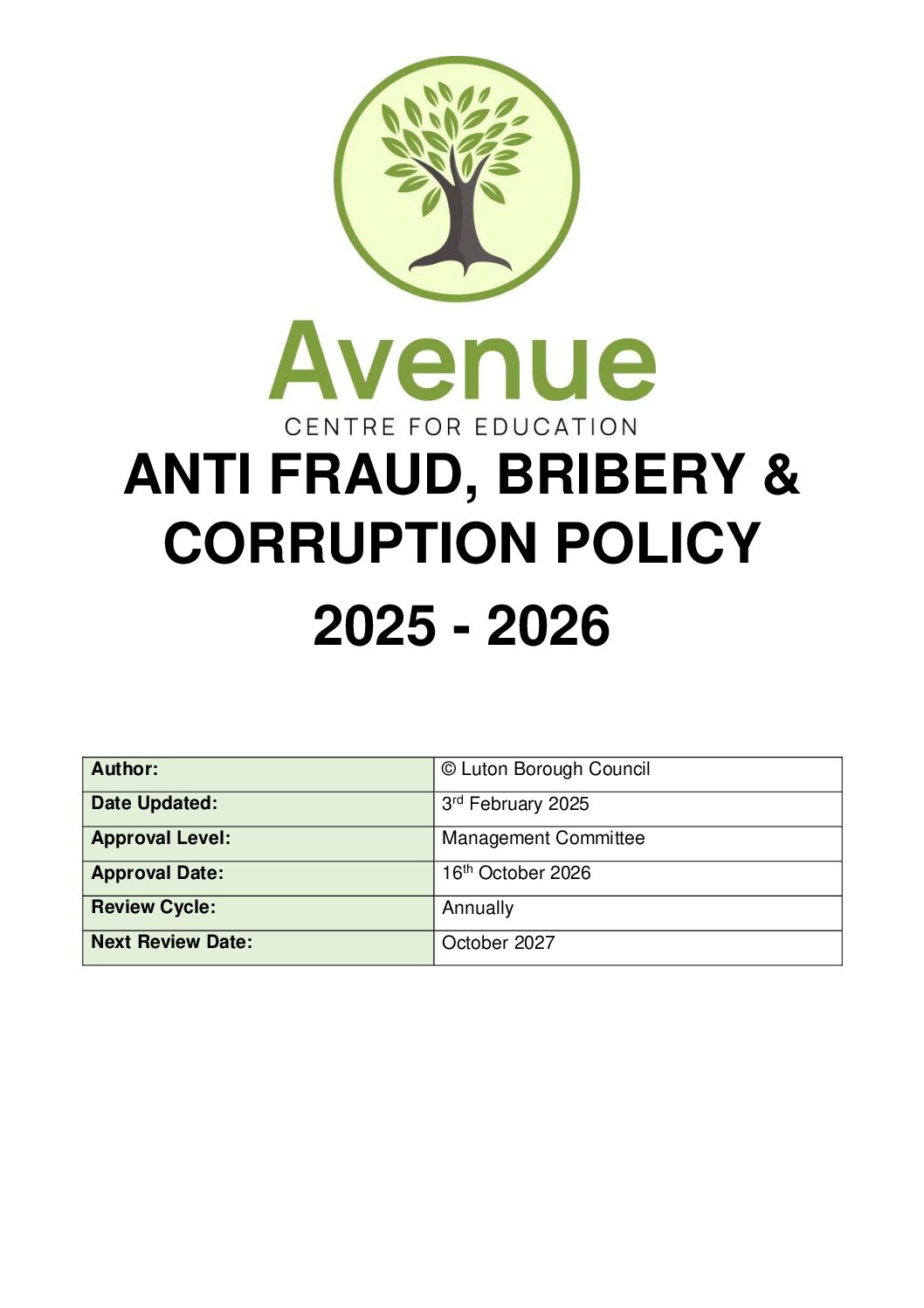 Finance: Anti Fraud, Bribery and Corruption Policy 2025 – 2026
